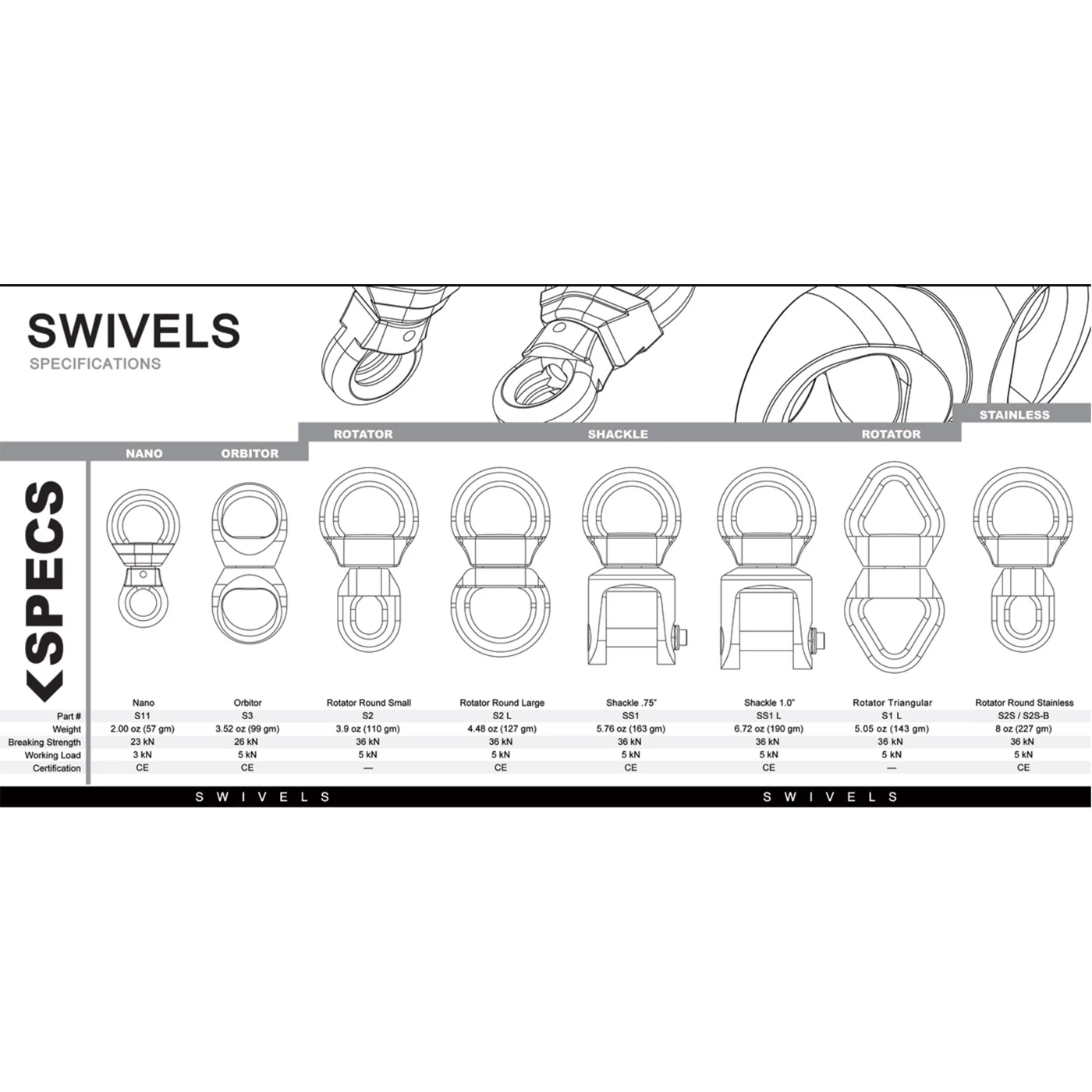 The Rotator Shackle Swivel saves valuable headspace by allowing you to connect webbing, eyes or thimbles directly to the swivel without a carabiner. The steel shackle bolt (.375″ 9.5mm diameter) will also increase the longevity of the swivel when connected to steel carabiners or cable. Rock Exotica designed and manufactured the first high-quality commercial swivels, and they now make the widest variety in the world. All of their swivels use high strength stainless axles and sealed ball bearings. Made in USA.